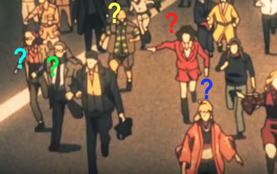 PURPLE CIRCLE: Interpol Detective Nanbara in his all-black attire. The trenchcoat and longer hair singles him out.